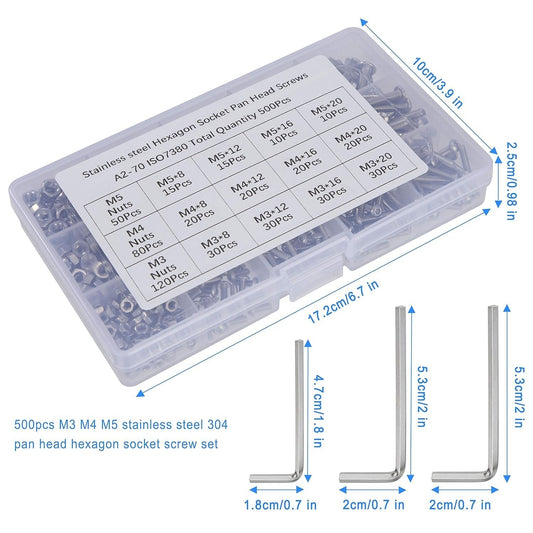 Assorted M3 M4 M5 Stainless Steel Hex Screws & Socket Bolts and Nuts 500pcs Kit Tool