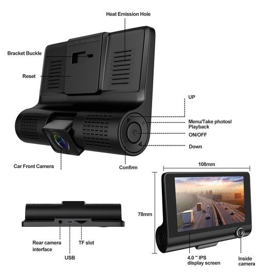 3 in 1 Car Dashcam Outside Inside Reversing 3 Camera Lens