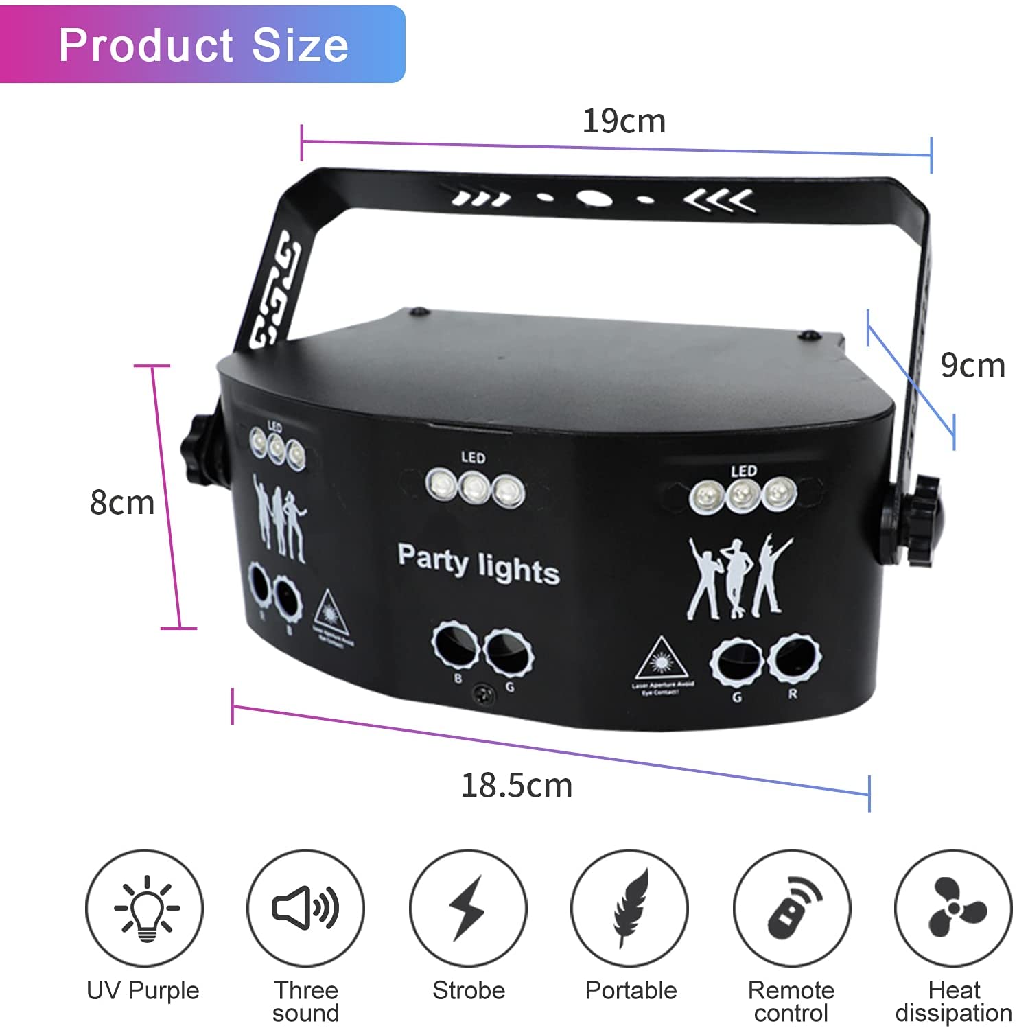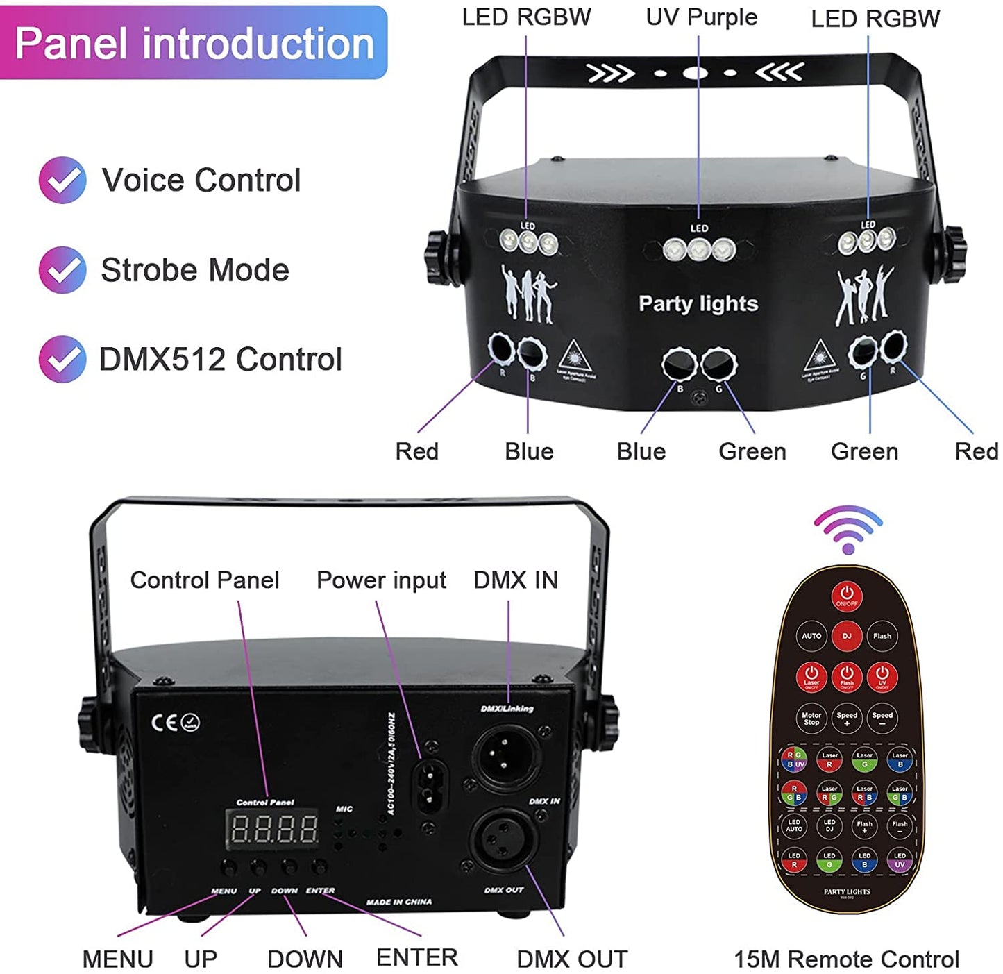 - Multi-Function Control: optional control modes, such as DMX 512, remote control, Sound actives, auto and master/slave mode for selection. Using the remote control, you can easily control the led stage lights without complicated DMX controller program