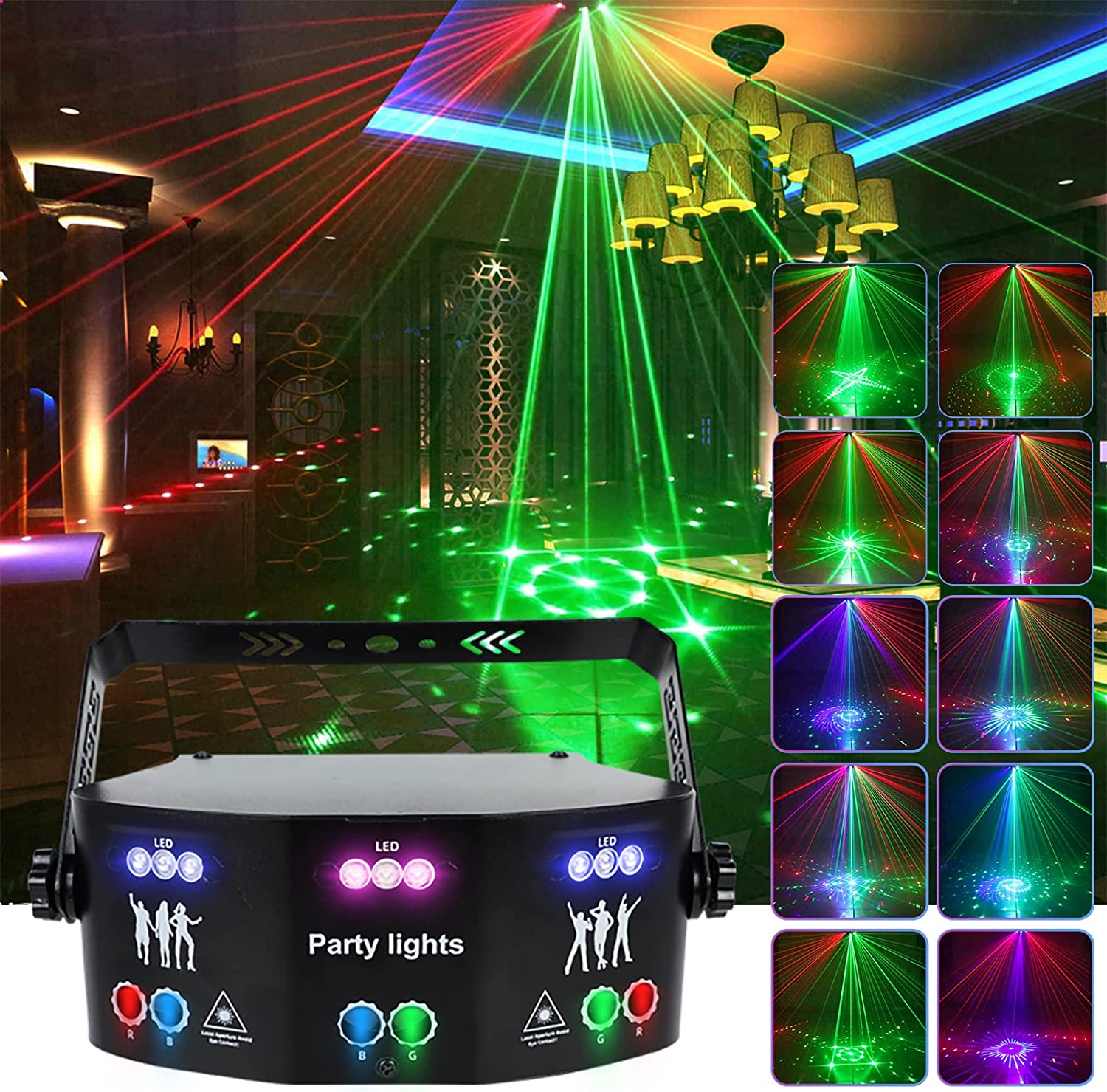 - Upgraded Stage Light: Our Disco Party lights is in 15 Lens design, the lighting area up to 600 Square feet, It can project 125 kinds of combination dynamic high-definition patterns (stars, beam light network, breakpoint effect, broken pen effect),and five kinds of LED light beams (red Green, blue, white and purple),It can create special strobe effect for 5 LED beams, bringing you an impressive Stage show experience.