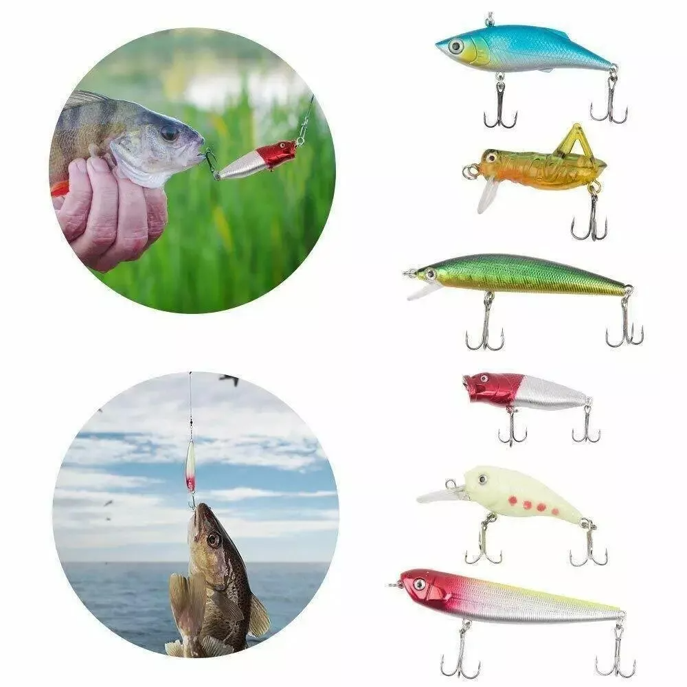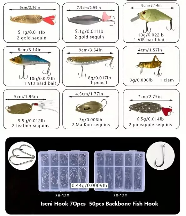 Package included:1pc Minnow Lure1pc VIB1pc Popper Lure1pc Pencil Lure1pc Crank Lure1pc Grasshopper12pcs Spinner57pcs Earthworm/Single Tail Maggots/Double Tail Maggots/Maggots/Shrimp/Frog158pcs Hooks & parts1pc Box