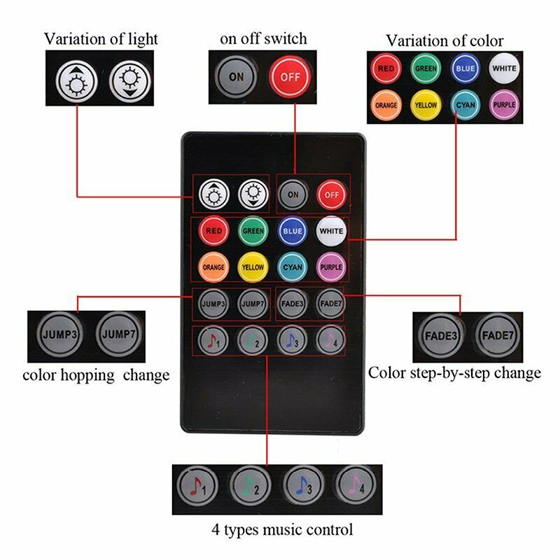 - Also sound-activated allows you enjoy the fun with the color changing following your car stereo music rhythm as well as your voice