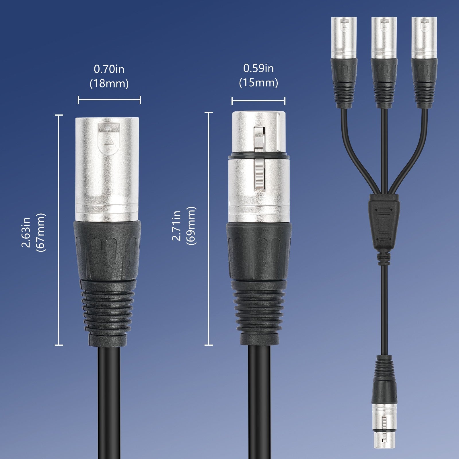 This 0.6m (2ft) XLR splitter cable is designed to connect one XLR female output to three XLR male inputs, allowing you to send a single audio signal to multiple devices. Ideal for professional audio setups, stage performances, and recording studios.