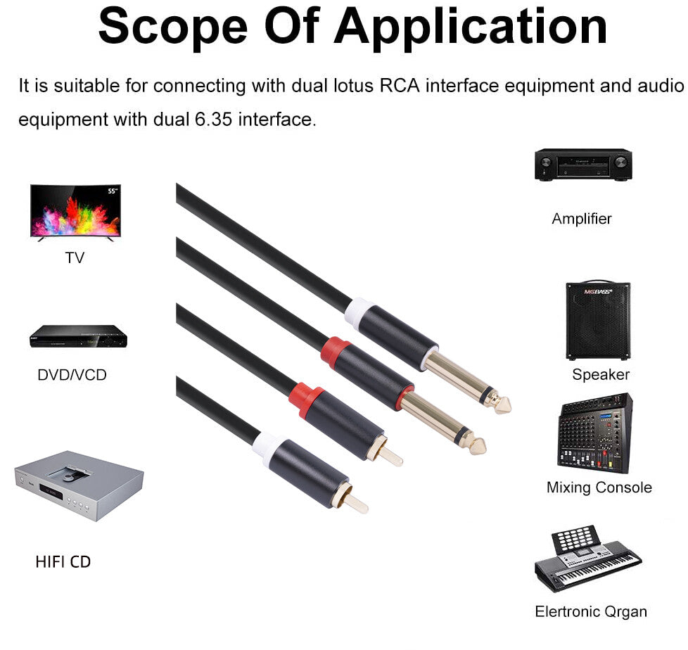 Dual 6.35mm 1/4 inch TS Mono Male to Dual RCA Male Adapter Audio Cable Cord for Mixer AmplifierFeatures: