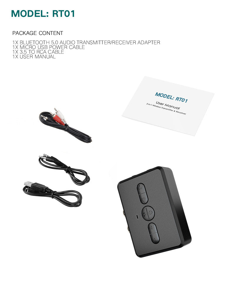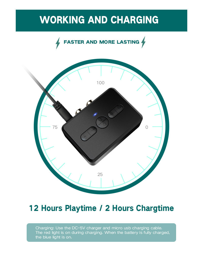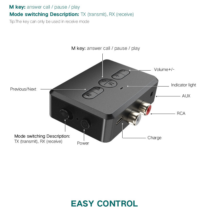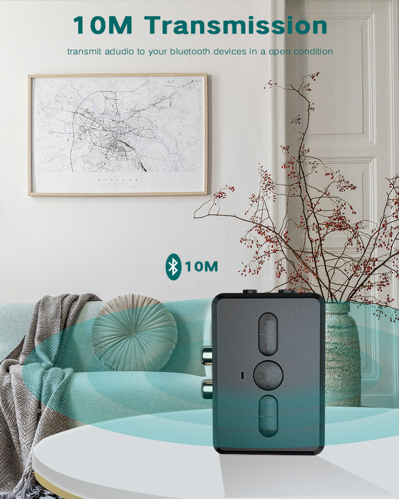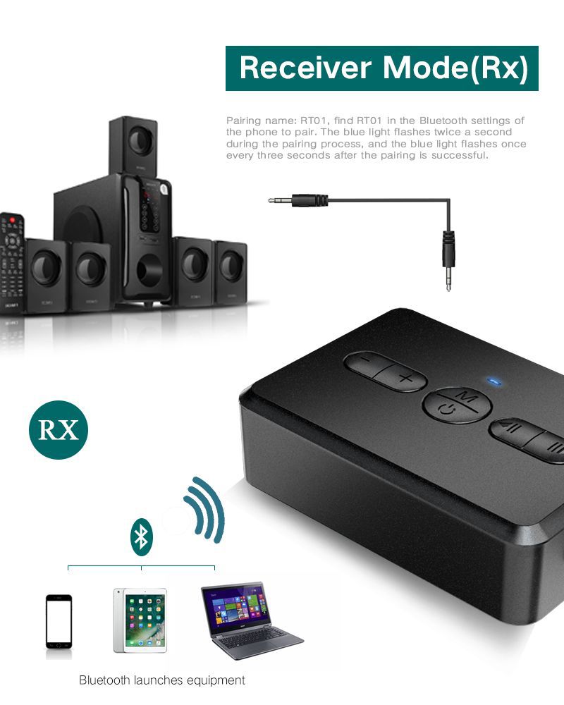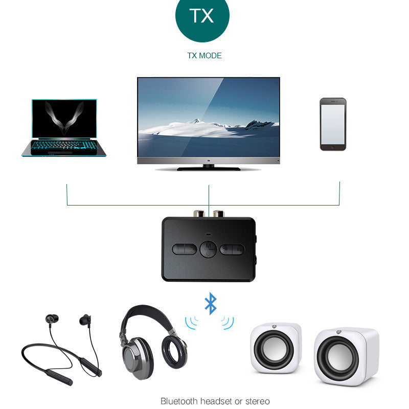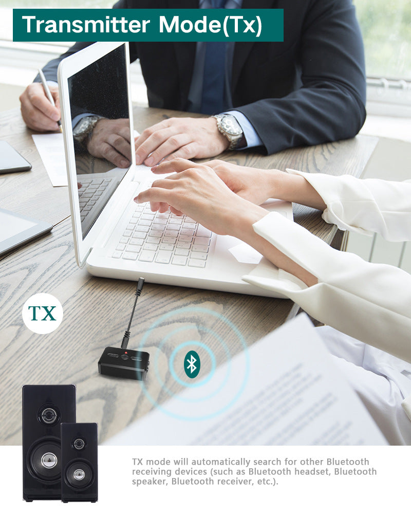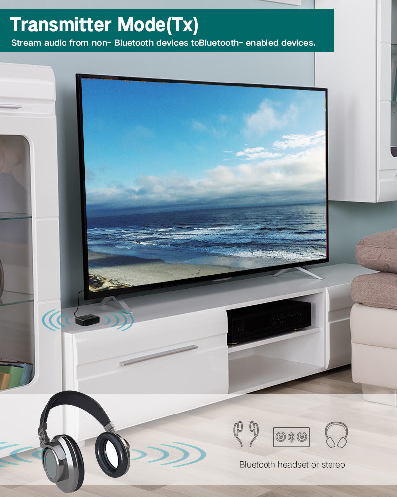 1. 2-in-1 Bluetooth-compatible transmitter and receiver, as a Bluetooth-compatible audio transmitter, is specially designed for audio devices without Bluetooth-compatible function (such as MP3, MP4, TV, PC, etc.). You can connect the Bluetooth transmitter to audio devices without Bluetooth-compatible function through the attached 3.5mm audio jack, change these audio devices to Bluetooth-compatible audio devices, and use them with Bluetooth-compatible headsets and speakers.
