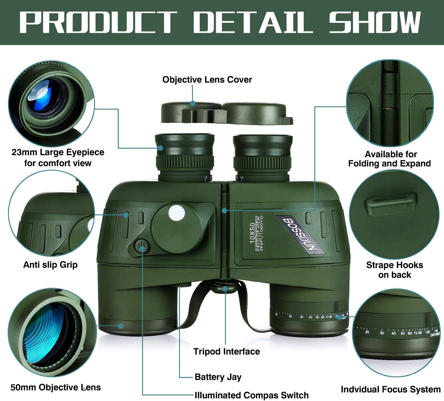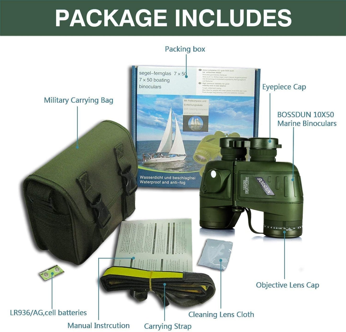 The BOSSDUN 10x50 waterproof floating Binoculars designed to meet military standards.It can be performed in all weather conditions,even under extreme rainstorms or high humidity condition.so it can provide you with all the tools needed for your next outdoor activities.such as marine,birding watching,hunting, sports matches watching,wild travel and more.etc.