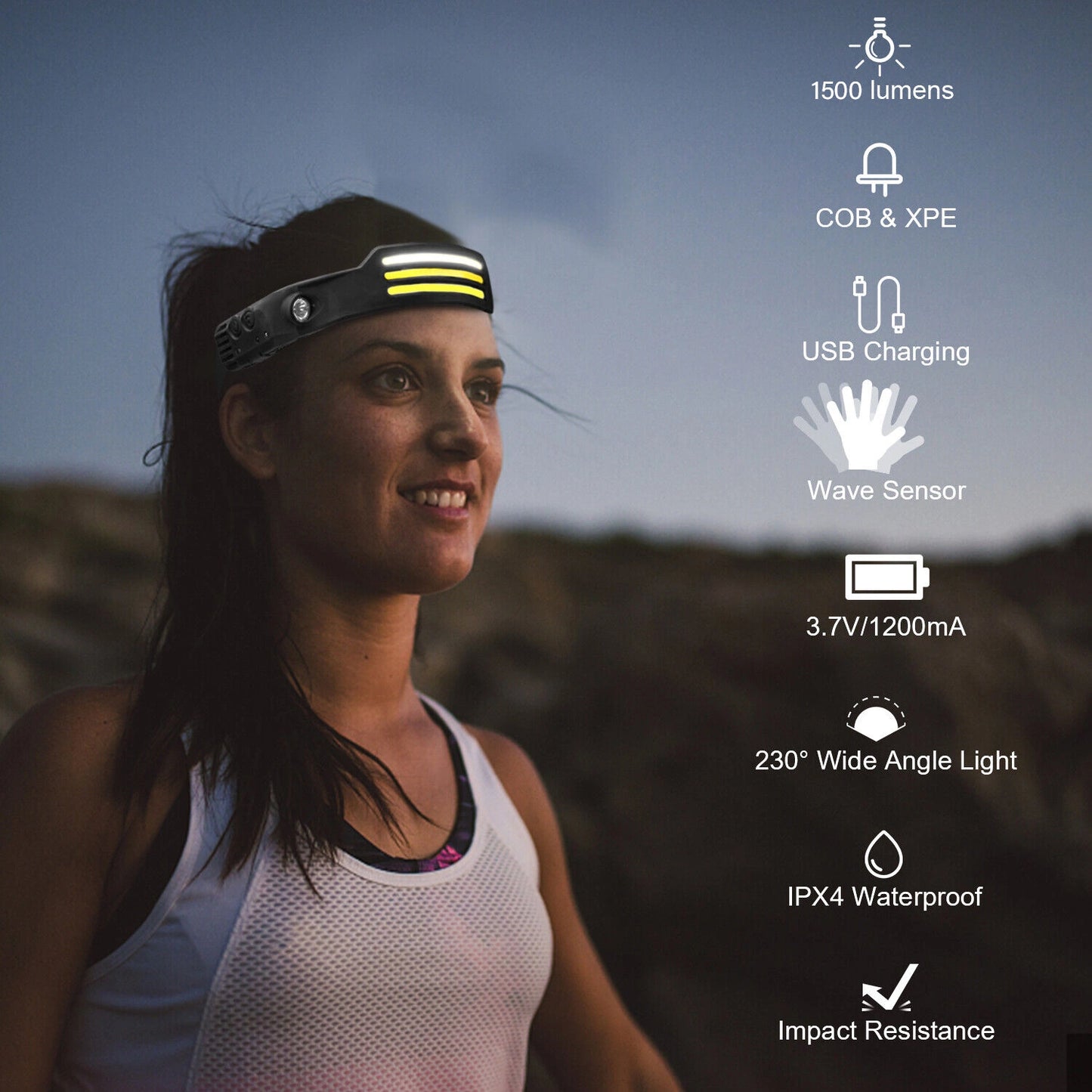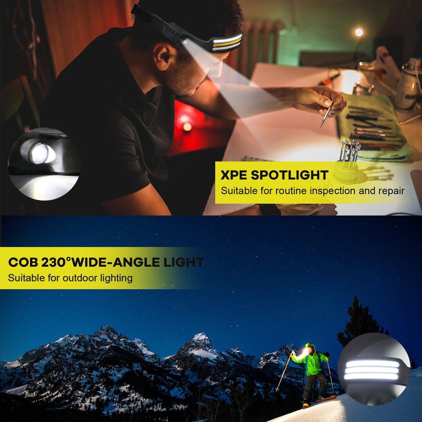 - (Motion Sensor & Easy to use): This rechargeable induction headlamp designed with motion sensor mode; easily control the headlamp even if you have gloves on; won’t dirty the unit as well as the gloves. Press the sensor button when the light is on; then you can switch the light ON/OFF by waving your hand. If there is any obstacle within 10 cm in front of the sensor receiver the light will also ON/OFF when sensor mode. Red and green indicator lights are on together when it is motion sensor mode.