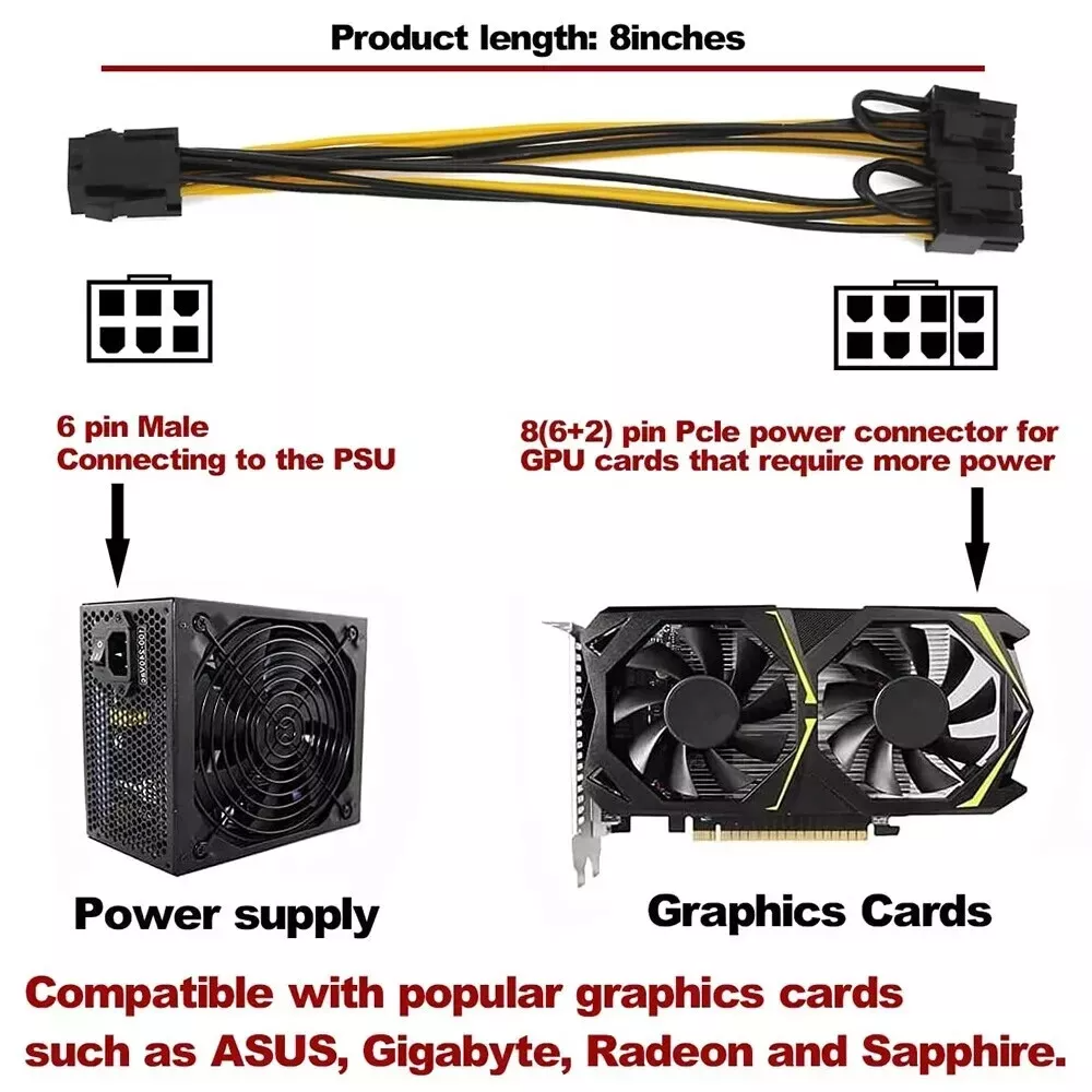 6 pin PCIe to 8 PIN PCIe adapter connects a PCIe video card with an 8 pin PCIe connection to a power supply with only 6 pin PCIe power connections; Check that your PSU is rated to power the video graphics card
