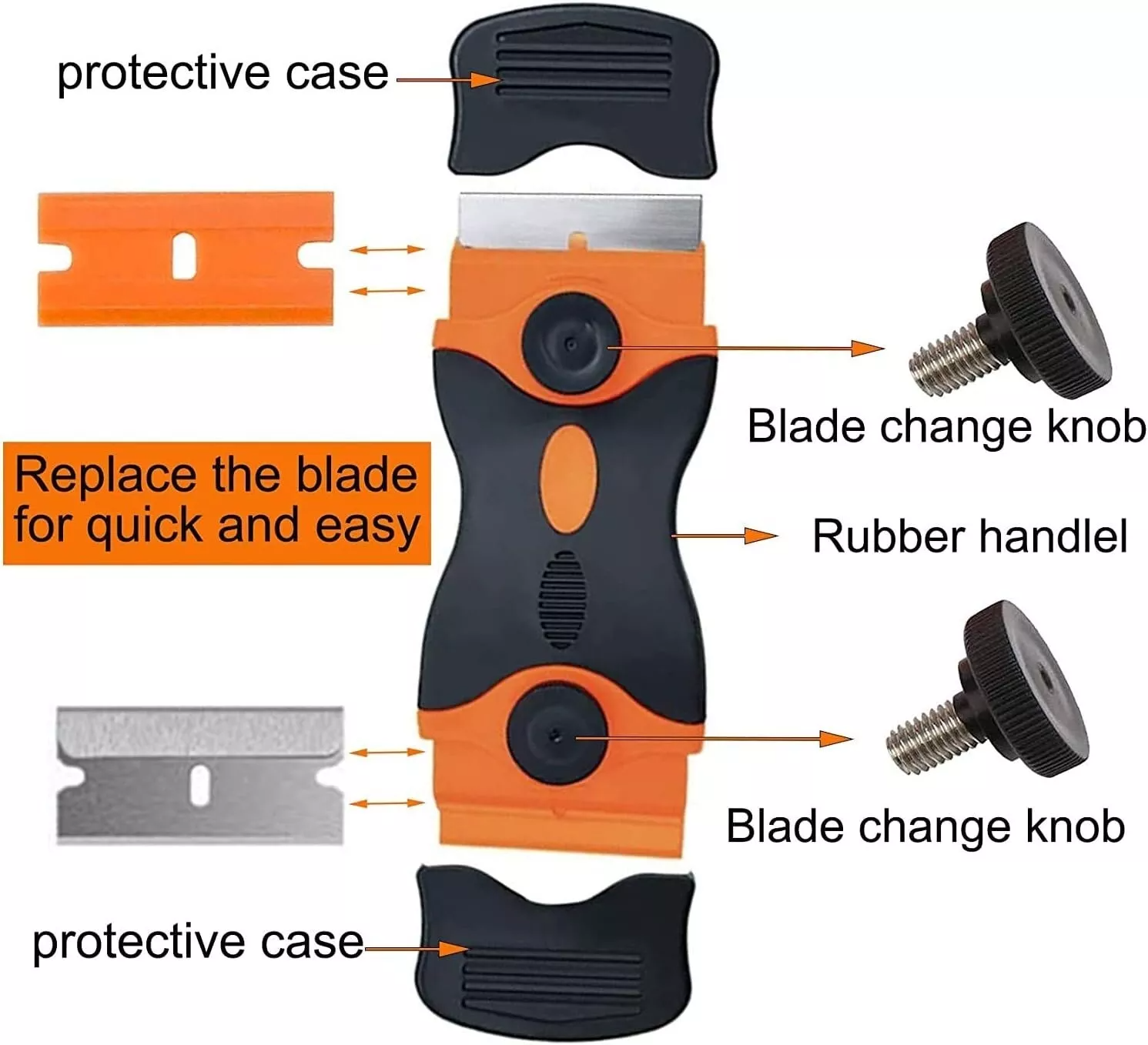 - [Easy to Use] - The are safety knob on both sides of plastic razor blade tool, which provides the good stability structure and make razor scrapers easy to replace the scraper blade. Just unscrewing the knob on the razor blade scraper, disassemble the upper cover to replace with a new blade, then fasten the knob. Be careful when you replace the blades