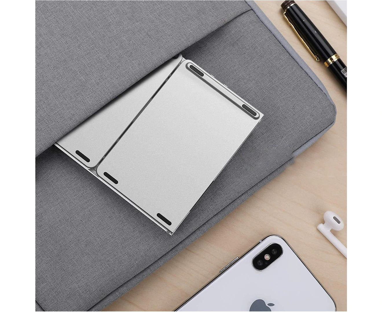 Introducing this Tri-Fold Bluetooth Keyboard with Touchpad Mouse, a versatile and compact keyboard suitable for Android, iOS, and Windows devices. With a working distance of 15m, this keyboard provides a seamless typing experience, while its lithium battery offers up to 20 hours of working time and 30 days of standby time. Crafted from durable ABS material, this keyboard has a sleek silver finish and weighs only 197.3g, making it easy to carry around. It has a tri-fold design that folds down to 15.7cm in length, 9.7cm in width, and 1.4cm in height, making it ideal for travelers and those who are always on the go. The keyboard layout consists of 63 keys in English, and it features a touchpad size of 54.8 * 44.8mm, providing a hassle-free mouse experience. The keyboard connects via Bluetooth and has a sleep time of 10 minutes to conserve battery life.