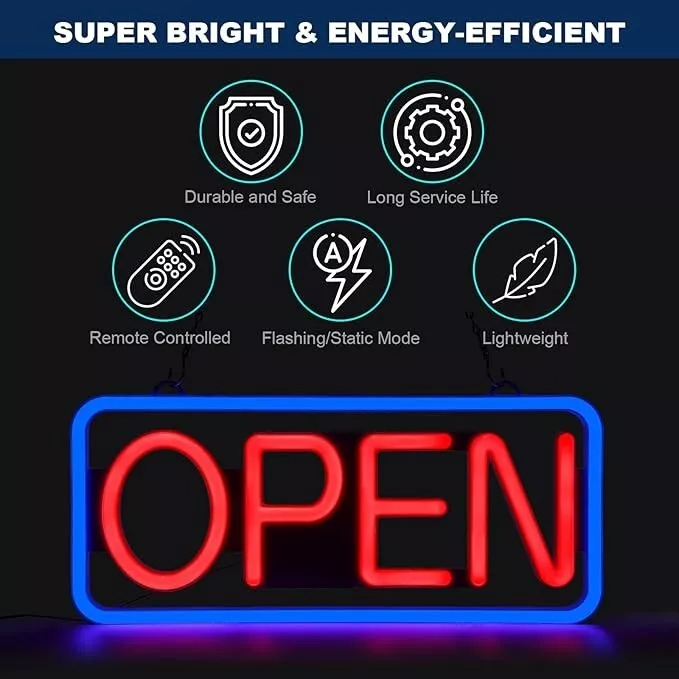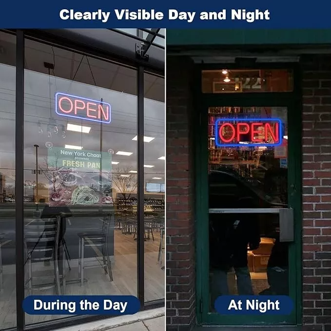 - BOOST YOUR BUSINESS - 54 x 25cm ultra bright large size open sign LED illuminated, super bright and eye-catching, much brighter and cost-effective than ordinary LEDs or Neon, excellent visibility even during the day time. 50000 Hour Rated LED Life, open sign with LED display have much longer lifespan than regular Neon lighted open signs because LEDs have no working parts that will break out.