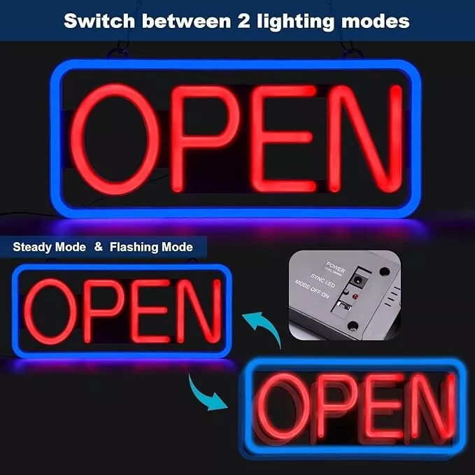 - DAY AND NIGHT BRIGHT - Attractive flashing or static mode, your neon style LED open sign has static or blinking and scrolling modes to attract customers by rendering striking lighting intensity through the dark window.